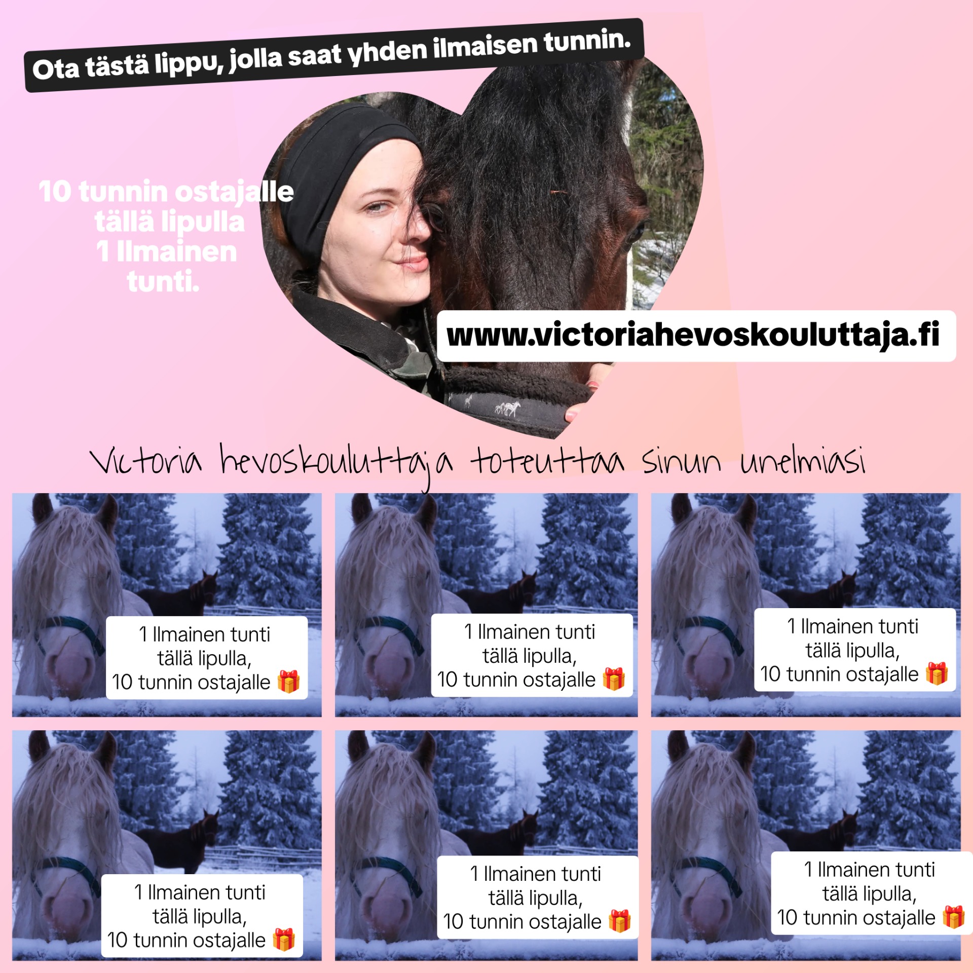 Olen jakanut Ilmainen tunti lippuja 🎁🎉👑🐴Joko löysit minne kaikkialle? Ilmaiseen tuntiin on oikeutettu, kun ostat 10 kerran paketin mihin tahansa Victoria hevoskouluttaja palveluun. 🎉👑🐴🎁 1 lippu per 10 tuntia / eli voit käyttää 2 lippua, jos ostat 20 tuntia jne.