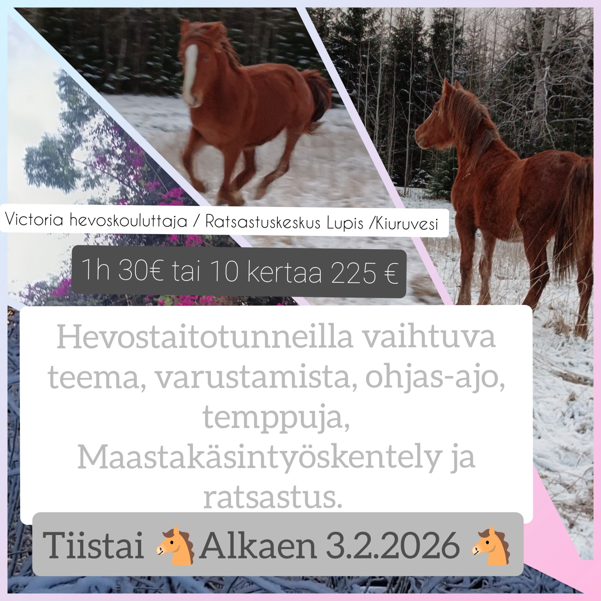 Tiistaina 3.2.2026 Alkaen heppakerho klo 18 - 19. Heppakerho on joka tiistai! Ystävysty hevoseen ja osallistu heppakerhoon 10 kertaa 200€ Ilmottaudu mukaan nyt ja varaa paikkasi.
