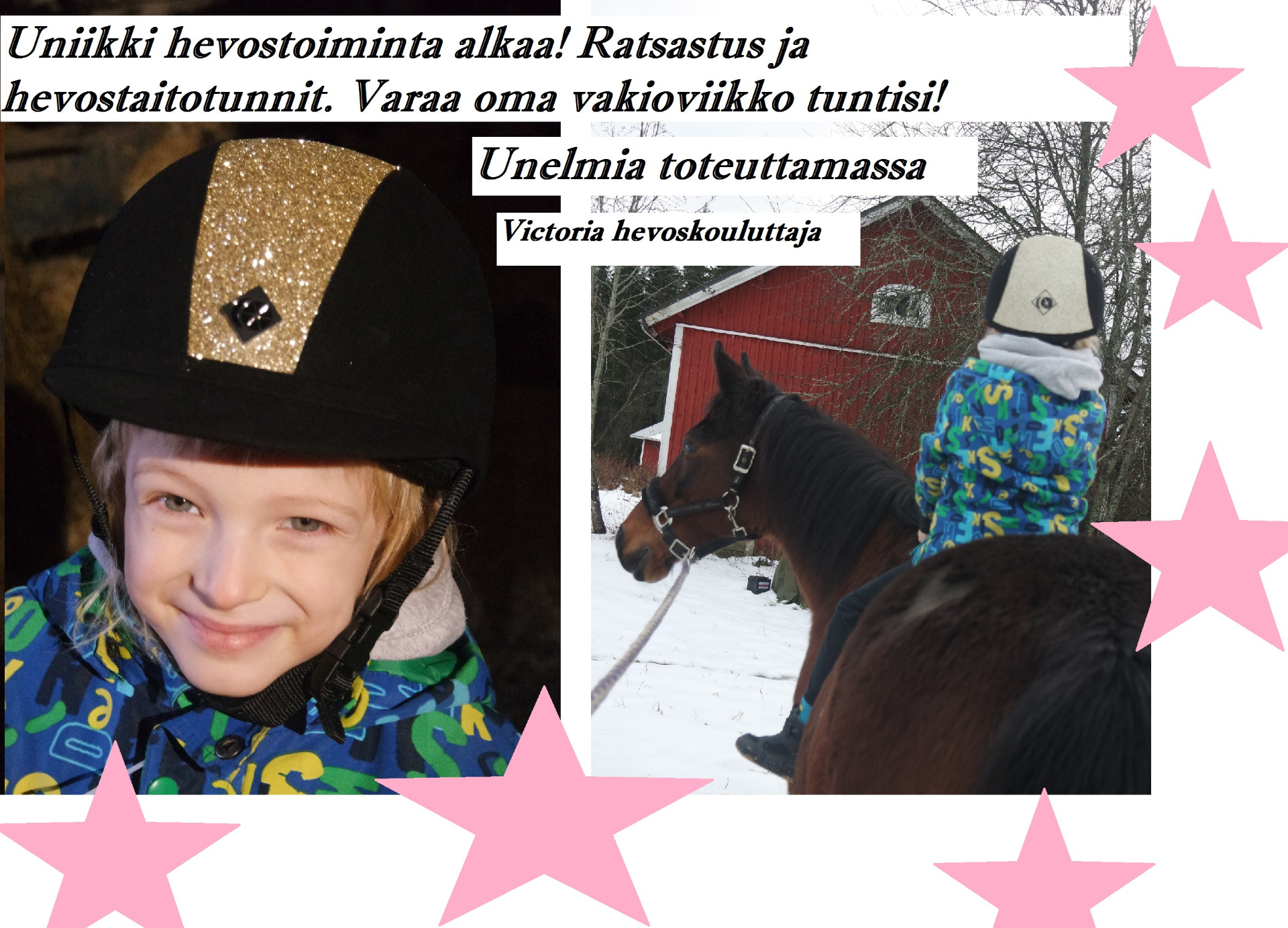 Hevosen omistaminen on vuosien sitoumus, nyt voit kasvaa yhdessä hevosen kanssa kuin sinulla olisi oma hevonen. Aloita tänään ja valitse oma unelma hevosesi. Etsin joukkoomme sitoutuneita ratsastajia, jotka haluavat oppia ratsastuksen lisäksi myös kaiken hevosen hoidosta, hyvinvoinnista, virikkeellistämisestä, laumaelämästä, elekielestä, käytöksestä, kouluttamisesta, ruokinnasta ja elinolosuhteista.