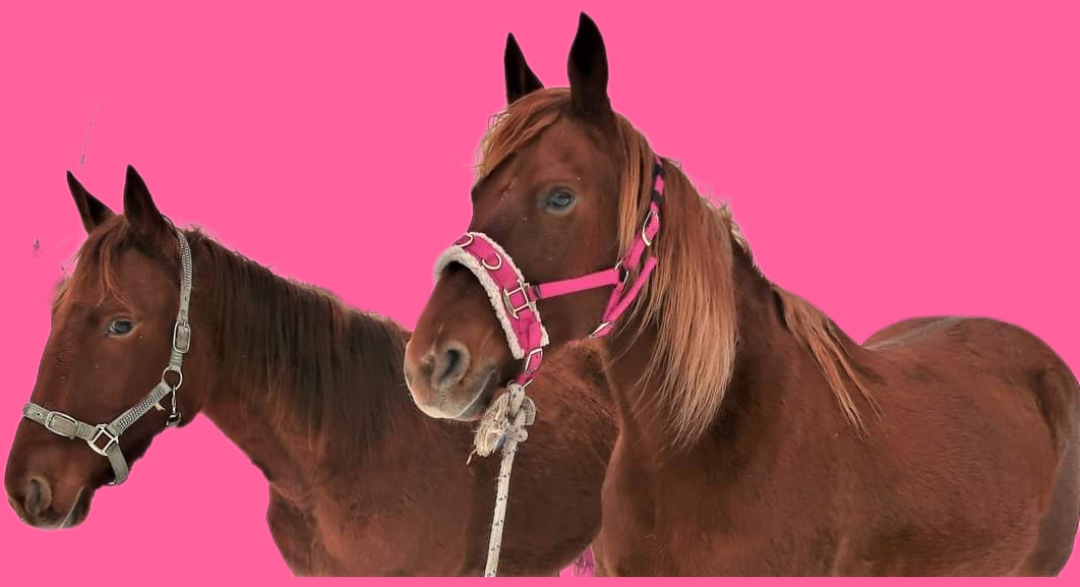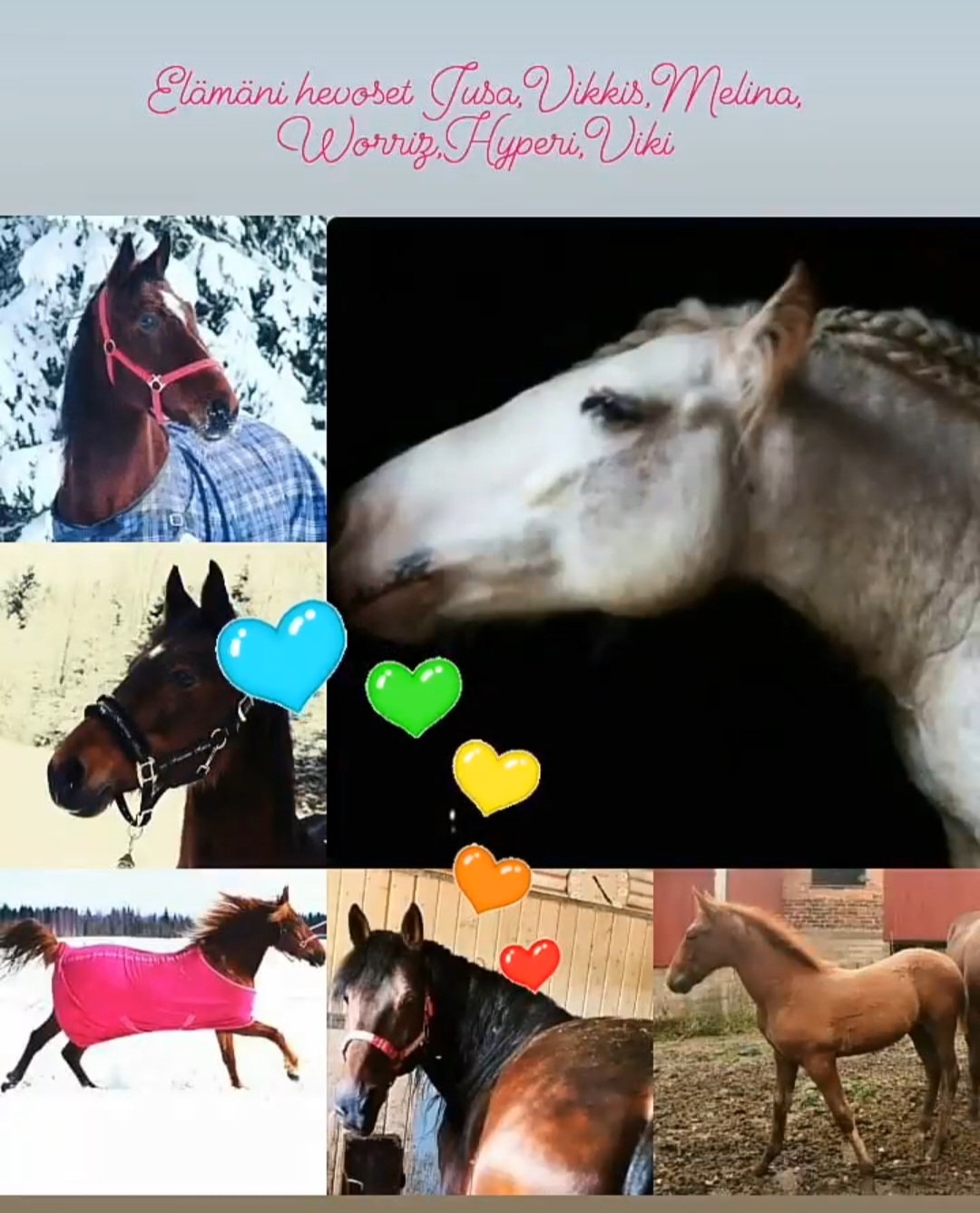 Tässä kuvassa vanhimmat rakkaimmat hevoseni, joista osa on jo kuollut (Jusa & Vikkis).