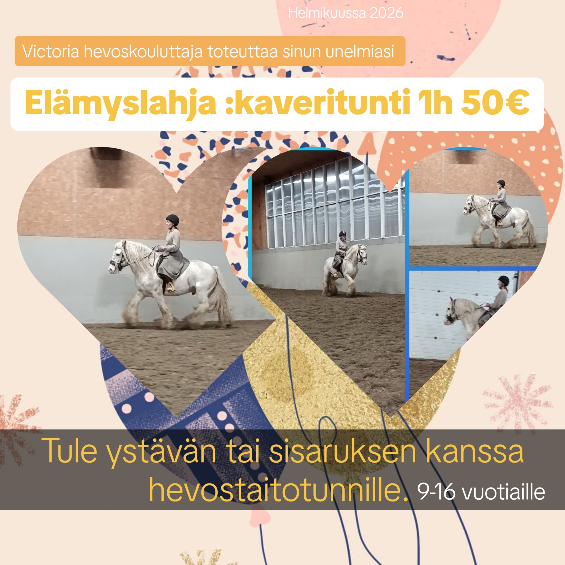 Hauskaa leikkiä sekä iloa. Victoria hevoskouluttaja toteuttaa unelmiasia ja osallistumalla nyt voit vaikuttaa millaisia opetushevosia meille tulee Kiuruvedelle! Täytä unelmakortti ja kerro minulle millainen on sinun unelmiesi hevonen! Käy instagram tutustumassa hevosiin ja varaa pian oma paikkasi ja olet mukana valitsemassa suosikkisi. Sinun unelmiasi kuunnellaan!